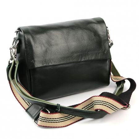 Женская сумка из натуральной кожи зеленого цвета. Закрывается на клапан и на молнию. Под клапаном есть карман с магнитной кнопкой. Внутри отделение, разделенное карманом на молнии по середине и боковые кармашки, один на молнии и один открытых. Снаружи, на задней стенке карман на молнии. Сумка имеет кожаный наплечный ремень и текстильный.