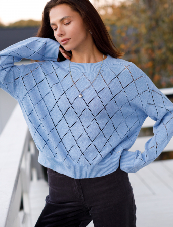 Укороченный джемпер выполнен узорной вязкой из мягкой хлопковой пряжи. Тонкий ажурный трикотаж идеально подходит для теплой весны и лета, в нем будет комфортно и не жарко. Изделие дополнено фирменным логотипом бренда. Сочетается в костюме с юбкой D36.013 и очень хорошо со светлым денимом.