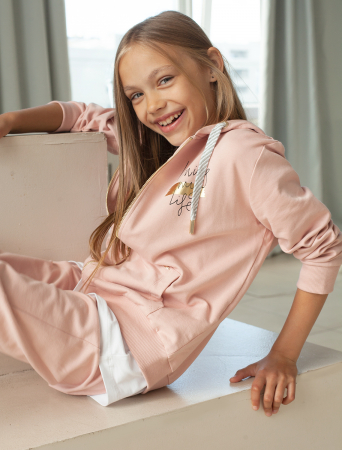 Пудровое худи на молнии с длинными рукавами и спущенной линией плеч сшито из премиального хлопкового футера. Материал отлично поддерживает циркуляцию воздуха, а крой не ограничивает движения. Модель с высококачественной золотистой фурнитурой украшена устойчивым принтом. Идеально в костюме с брюками F44.060