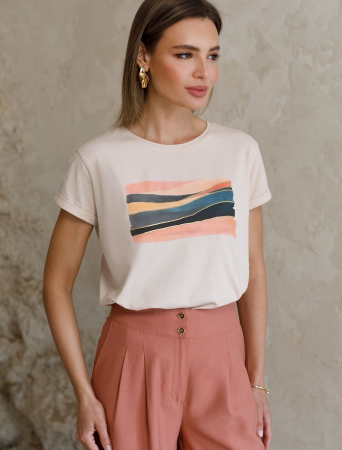Футболка выполнена из премиального хлопка с эластаном. Авторский принт нанесен красками с устойчивым покрытием. Модель среднего объема дополнена подворотами на рукавах. Легко впишется в повседневные аутфиты и добавит акцента в образы. Изделие дополнено металлическим логотипом бренда.