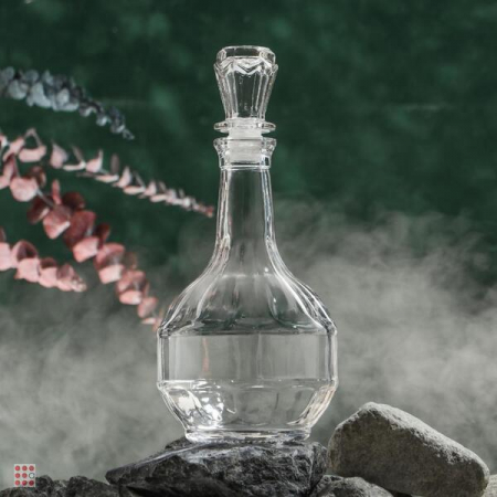 Особенность дизайна — геометрическая форма с рельефными гранями, создающими эффект куба. Широкое основание обеспечивает устойчивость, а тонкая шейка позволяет аккуратно наливать жидкость. Стеклянная пробка плотно закрывается, сохраняя свежесть содержимого и придавая графину завершённый вид.