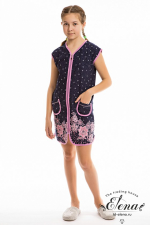 Халат для девочки выполнен из хлопкового полотна. Центральная застёжка на молнию, детали халата обработаны бейкой контрастного цвета. По бокам размещены карманы.