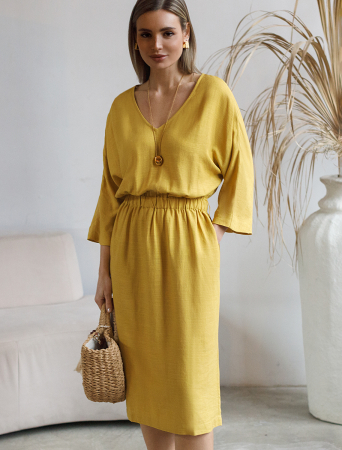 Платье выполнено изо льна с вискозой. Модель с V-вырезом и с цельнокроеным рукавом в стиле кимоно дополнено вшитым поясом из эластичной резинки. В комплект входит ремешок из эко-замши с золотистым кольцом. По бокам два кармана. Лён в составе обеспечивает прочность и воздухопроницаемость, вискоза эластичность и гладкость ткани. Благодаря такому сочетанию изделие хорошо драпируется, меньше мнется и сохраняет форму в течении долгого времени.