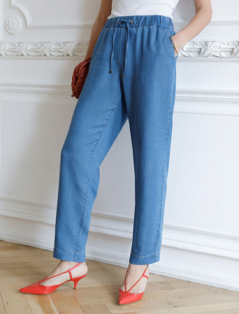 Брюки-дудочки выполнены из лиоцелла. Модель с эластичным поясом на резинке дополнена регулируемым шнуром из основного полотна, боковыми карманами и одним карманом сзади. Ткань с характерным атласным блеском полностью имитирует обычный деним, но в тоже время намного более мягкая, плавно струится по телу, хорошо драпируется и охлаждает кожу в жаркое время года. Изделие сочетается в костюме с блузкой D59.017