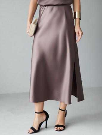 Юбка миди кофейного цвета с разрезом из струящегося плотного сатина — находка для модниц, ценящих элегантную классику и современный стиль. Модный крой длинной юбки подчеркивает фигуру, а мягкий эластичный пояс обеспечивает дополнительный комфорт на протяжении всего дня. Благодаря продуманному крою, юбка хорошо сидит на фигуре и подчеркивает силуэт без лишних деталей, подойдет для обладательниц пышных форм и девушек маленьких размеров. Шелковистая текстура материала приятно ощущается на коже, не просвечивает и сохраняет форму даже после длительной носки. Гладкая поверхность добавляет благородного блеска, делая образ неповторимым и шикарным в любой ситуации. Струящийся плотный сатин отличается устойчивостью к сминанию: юбка не мнется, что позволяет выглядеть безупречно на работе, встрече или прогулке. Атласная юбка придает образу элегантный и благородный вид, а разрез добавляет легкую динамичность и создает утонченный акцент на линии ног, сохраняя при этом сдержанную женственность. Юбка визуально вытягивает силуэт, делая походку грациозной и легкой.