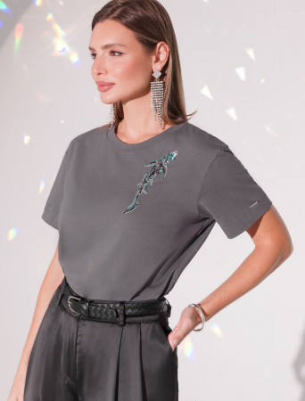 Стильная базовая футболка темно-серого цвета с принтом пайетками в виде рыбки выполнена из плотного хлопка с эластаном для комфортной посадки на любую фигуру. Прямая футболка классического кроя с круглым вырезом, прекрасно подходит для разных типов фигуры, в том числе и на большие размеры. Мягкость хлопка вместе с небольшой долей эластана гарантирует идеальную посадку и свободу движений. Легкая натуральная дышащая ткань премиального качества делает футболку с коротким рукавом идеальным вариантом для повседневной носки дома, на работу или офис. Однотонная футболка дополнена авторским аккуратным принтом зебра, который придает праздничный и элегантный вид без лишней вычурности. Блестящий анималистичный принт аккуратно украшает, добавляя изысканный акцент и создавая легкий мерцающий эффект.