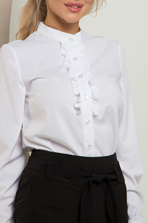 Женственная блуза прямого силуэта из нежной блузочной ткани. Длинные втачные рукава заканчиваются манжетами на пуговицах. Горловина дополнена воротником-стойкой, переходящим в планку с застежкой на пуговицы. По переднему полотнищу – оборки. Низ ровный, по бокам небольшие разрезы. Модель придаст Вашему деловому образу очарования.