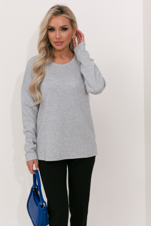 Практичный джемпер из трикотажного полотна свободного кроя со спущенным плечом. Круглая горловина на обтачке. Модель без застежек. Низ ровный, по бокам небольшие разрезы.