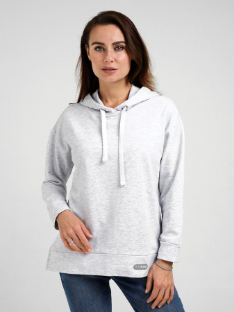 Женская толстовка в спортивном стиле Comfort fit (свободного покроя). Выполнена из комфортного трикотажного полотна футера. Длинные рукава с манжетами, удобный капюшон на подкладке с хлопковым белым плоским шнуром. В боковых швах разрезы.