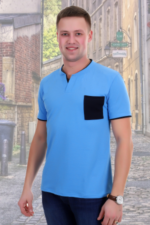 Мужская футболка из кулирки с лайкрой. Воротник-стойка с небольшим треугольным вырезом, темная окантовка горловины и рукавов, темный накладной карман на груди.