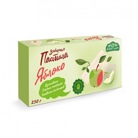 Бархатный, необыкновенно нежный и в то же время очень «выразительный» десерт с насыщенным яблочным вкусом. Представляет собой воздушный батончик из нескольких пластов взбитой пастильной массы, покрытого сладким слоем тающей во рту сахарной пудры. Ненавязчивая кислинка эффектно контрастирует с изысканной сладостью, создавая по-настоящему интересный и незабываемый смак. Это лакомство непременно придется вам по вкусу, к тому же оно состоит исключительно из натуральных компонентов, полезных для здоровья.