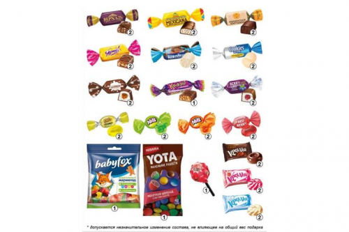 Подарок из глазированных и неглазированных конфет, карамели, жевательного мармелада, шоколадного драже и карамели на палочке.