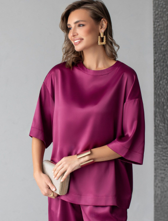 Блузка с короткими рукавами цвета бургунди из струящегося плотного сатина создана для ценительниц комфорта и элегантности. Материал отличается высокой плотностью, что делает блузку устойчивой к износу и сохраняет аккуратный внешний вид даже при длительном использовании. Струящаяся ткань элегантно ложится по фигуре, подчеркивая достоинства силуэта без лишней утяжеленности, в тоже время приятно ощущается на теле.