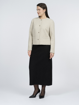 Короткий жакет прямого кроя сшит из плотной твидовой ткани с овечьей шерстью. Он хорошо держит форму и согревает в прохладную погоду.