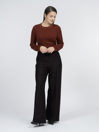 Небольшой круглый вырез и длинные рукава делают модель комфортной для осенне-зимнего сезона, а отделка горловины золотистой металлизированной нитью добавляет модели визуального интереса.