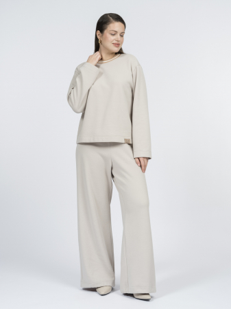 Прямые широкие брюки сшиты из особого хлопкового трикотажа с плюшевой изнанкой, а потому уютны и приятны на ощупь. Хлопок тактильно комфортен, гипоаллергенен и хорошо дышит, а полиэстер делает ткань прочной и долговечной.