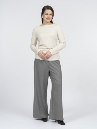 Элегантный вырез-лодочка и длинный рукав со спущенным плечом создают мягкий, женственный силуэт. Легкая сборка по боковым швам на уровне талии делает модель еще выразительнее.