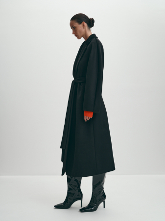 Пальто сезона Осень из овечьей шерсти на поливискозной подкладке отлично подходит для осени и мягкой зимы. Это стильная модель прямого силуэта с английским воротником и цельнокроеным рукавом. Приталенное, благодаря поясу, пальто придаёт изящество и женственность фигуре. Пальто прекрасно гармонирует с платьем и юбками разной длины, классическими брюками, джинсами. Карманы в боковых швах не перегружают образ, а высокая шлица обеспечивает комфортный шаг. Модная модель пальто-халат является базовой, уместна в деловом, casual (кэжуал) и спортивном стиле, подходит для офиса и для прогулок. Стильный черный вытягивает силуэт и универсален в сочетаниях.