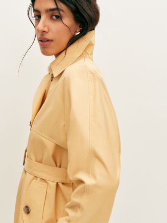 Классический тренч нежного светло-желтого оттенка с отлетными кокетками станет акцентной вещью в вашего образа. Модель прямого силуэта с широким отложным воротником и карманами с клапаном комфортно сядет по фигуре, а линию талии можно подчеркнуть элегантным регулируемым поясом. Изюминкой модели стали длинные свободные рукава с декоративными патами с пряжками. Тренч легко впишется как в классические образы с брюками, так и более расслабленный с джинсами из коллекции.