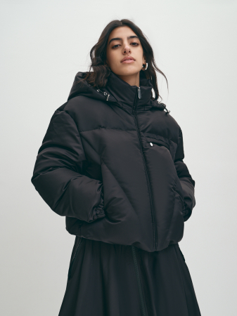 Теплый стильный пуховик на молнии, из плащевой ткани с влагозащитной пропиткой, подходит для осени и зимы. Качественный наполнитель из пуха и пера делает модную модель очень теплой и ультралегкой. Наполнитель равномерно распределен внутри куртки благодаря упаковке из пуходержащей ткани. У модели двойная ветрозащитная подкладка для исключения проявления пуха. Высокая стойка, капюшон с фиксаторами, кулиска по низу, рукава с резинками, функциональные карманы и ветрозащитный внутренний клапан защитят от непогоды. Стеганый капюшон отстегивается, образ можно дополнять шапками и палантинами, произведенными на наших собственных фабриках. Короткая куртка в молодежном стиле с удобным дополнительным нагрудным карманом на молнии необходима в гардеробе, а если подобрать размер на один-два больше обычного, можно формировать модный силуэт оверсайз. Базовый черный универсален. В коллекциях наших брендов представлены разнообразные светлые оттенки и яркие цвета, позволяющие подобрать самые разные образы. Индекс Fill Power 630-650 - это показатель натуральных наполнителей премиум-класса.