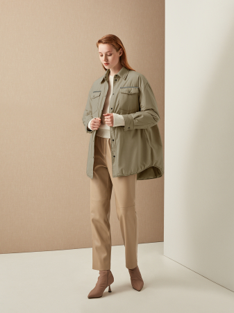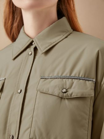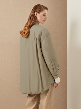Демисезонная куртка - оверсайз в рубашечном стиле А-силуэта в оттенке хаки. Модель с утеплителем, который придает дополнительный объем. Фирменный крой: отложной воротник, приспущенная женственная линия плеча, асимметричный подол, удлиненный сзади. Плотная плащевая ткань защищает от влаги и ветра, дополнительную защиту также дает прочная застежка на кнопки, спрятанная под планкой. Спереди куртка украшена объемными карманами с клапанами на кнопках. Отличный выбор для гардероба в спортивной стиле и прогулок на природе.