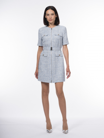Маленькое платье с наступлением весны обрело новый цвет. Модель актуальной длины мини выполнена с круглым вырезом и функциональной застежкой на встречную молнию впереди. Четыре талиевые и две нагрудные вытачки формируют привлекательный полуприлегающий силуэт. Пояс из основной ткани, по спинке выполненный на резинке, дополнительно подчеркивает талию. Клапаны с гербовыми пуговицами - дань стилю Chanel. Платье выполнено на полной подкладке, что обеспечивает прекрасную посадку для модели из фактурной ткани. Смесовый лейс-твид с содержанием шерсти, на основе крученой нити, необычайно легкий и воздушный, он прекрасно подходит для производства женской одежды и требует к себе особого отношения - платье необходимо беречь от острых предметов. Лейс-твид выполнен из нитей разных цветов, основные - бледно-голубой (Whispy Blue) и белый. Встречаются также нити синего и бежевого цветов, это позволяет расширить палитру моделей-компаньонов и аксессуаров для платья.