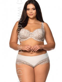 Бюстгальтер Lara U выполнен на косточках, чашки шитые, на тонком поролоне, внутренняя сторона проложена хлопковым трикотажем, внешняя сторона из цветного кружевного полотна. Бретельки не отстёгиваются, спереди с кружевом, регулируются по длине. Спинка из телесной микрофибры продублирована мягкой сеткой. На спине застёжка на удлинитель, количество крючков в ряду застёжки, увеличивается пропорционально размеру бюстгальтера. Бюстгальтер идеально сочетается с трусиками Lara.