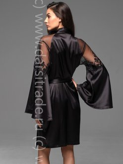 Короткий запашной халат Mia-Amore с широким длинным рукавом длиной. Халат выполнен из однотонного смесового шелка с кружевными вставками по верхней части рукава. По бокам изделия расположены карманы.