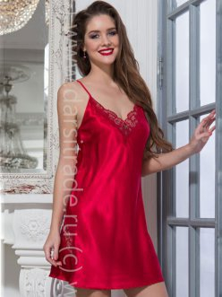 Короткая сорочка без подреза под грудью полуприлегающего силуэта на тонких бретелях, выполнена из однотонного искусственного шелка. Оригинальные кружевные вставки расположены по верху и бокам сорочки. Декор - атласный бантик по центру топа.