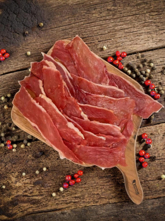 Мясные чипсы хороши как к пиву, так и просто пожевать в удовольствие, смакуя вкус мяса и аромат пряностей. Благодаря рецепту изготовления чипсы эластичны, ломаются с усилием, при этом достаточно легко жуются.