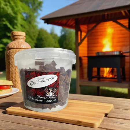 Идеально подходят как самостоятельный перекус или оригинальная закуска к пиву. Упакованы в удобные пластиковые ведра по 900 г — достаточно для большой компании. Натуральный состав и выразительный мясной аромат делают эти гренки прекрасным выбором для тех, кто ценит насыщенные и дымные вкусы.