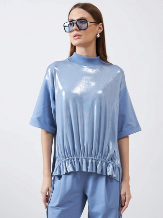 Простой и в тоже время стильный голубой джемпер из новой коллекции VAL поднимет ваш повседневный образ на новый уровень. Передняя часть джемпера привлекает внимание благодаря мерцающему материалу, который придает образу особую праздничность. Сзади джемпер выполнен из мягкого голубого трикотажа, обеспечивая комфорт и свободу движения.