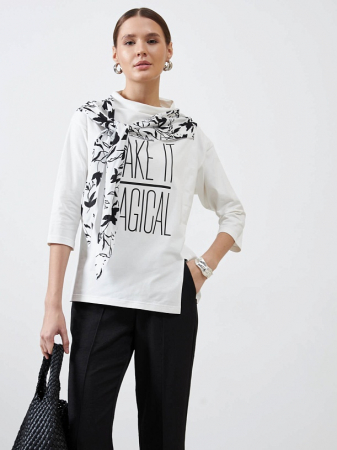 Трикотажная блуза из весенней коллекции VALS украшена акцентным шарфом, который придает легкость и элегантность образу. Прямой фасон обеспечивает свободу движений и комфорт в повседневной носке.