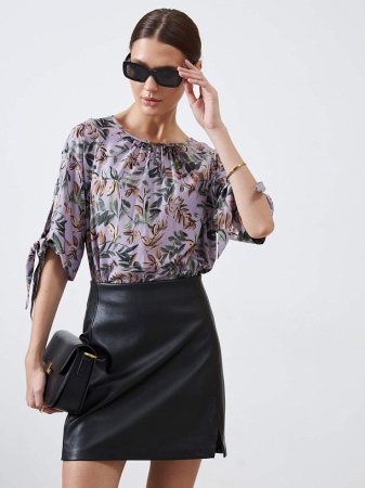 Блуза с привлекательным растительным принтом выполнена из 100% вискозы. Этот стильный элемент гардероба дополнен завязками на рукавах, которые добавляют нотку изысканности. Блузу можно носить ее как в расправленном виде для свободного и легкого образа, так и заправленной для более строгого и элегантного стиля.