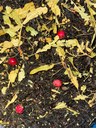 ягоды барбариса и клюквы, листья смородины, сафлор, рябина красная, боярышник, чай черный
