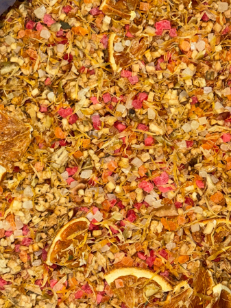 Состав: цукаты клубники, цукаты ананаса, кусочки яблока, кусочки кураги, лепестки календулы, лепестки сафлора, сегмент апельсина