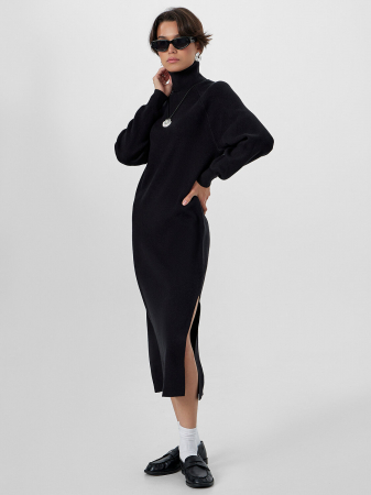 Женское платье с длинными рукавами — элегантная модель для прохладного сезона. Высокий воротник-стойка не только эффектно обрамляет шею, но и надежно защищает холода. Длина ниже колен и рукава, зауженные на манжетах, создают утонченный, вытянутый силуэт. Стильный вырез на левом бедре — вносит в образ ноту современности.