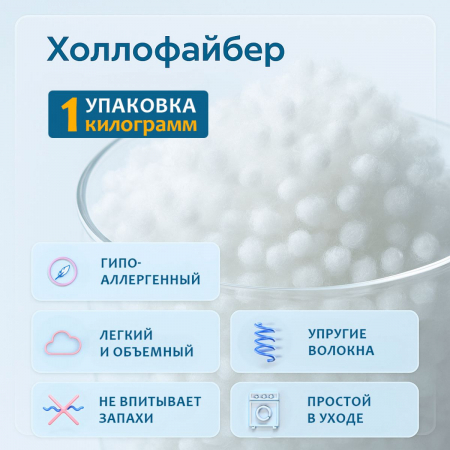 Холлофайбер – это идеальный синтетический наполнитель, который обеспечит комфорт и уют в вашем доме. Изготавливаемый из полиэфирного волокна, он представляет собой небольшие упругие шарики, которые благодаря воздушным прослойкам делают наполнитель мягким, объемным и легким.