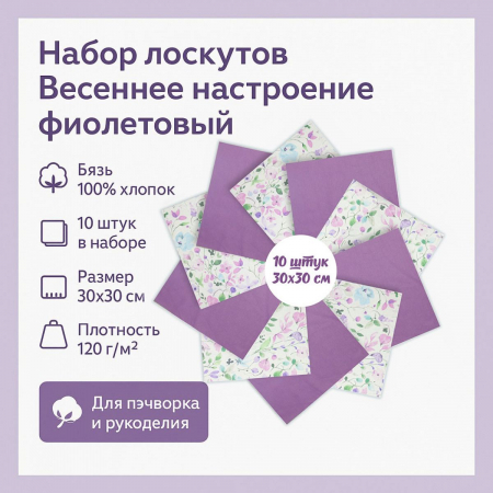 Погрузитесь в атмосферу весеннего обновления с набором весовых лоскутов "Весеннее настроение сиреневый". Эти 10 лоскутов размером 30x30 см, выполненные из 100% хлопка, идеально подойдут для вашего следующего пэчворк-проекта.