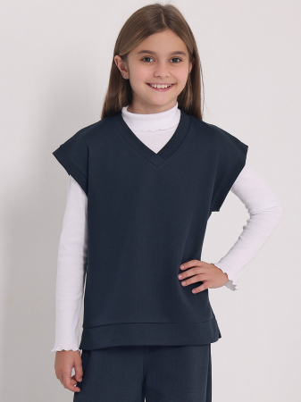 Жилет для девочки из плотного полотна с рельефным рисунком, выполненным с применением жаккардового плетения. Изделие прямого кроя с v-образным вырезом горловины, без карманов и со спущенной линией плеча. Отличный вариант для школы и не только! Уход: только машинная стирка (руками не стирать!) при температуре 40 градусов, без предварительного замачивания.