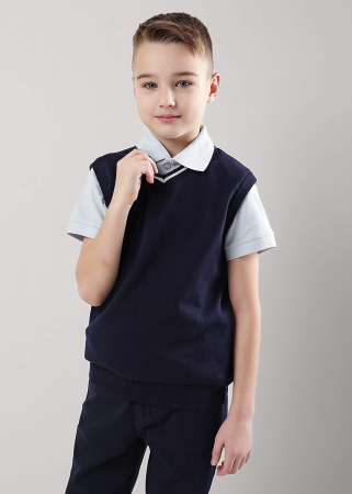 Вязаный жилет для мальчика из 100% хлопка с V-образным вырезом горловины. Горловина изделия украшена контрастной полосой.