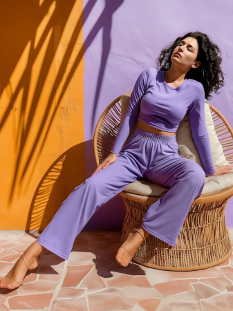 Оригинальный костюм-двойка из кулирки сиреневого цвета . Укороченный кроп с длинными прямыми рукавами и округлой горловиной. Расширенные брюки прямого силуэта с широким цельнокроенным поясом на резинке. Изделие выполнено из трикотажа премиального качества - ПЕНЬЕ, с содержанием хлопка более 95%