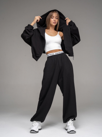Женский костюм из футера(3х нитка) черного цвета без начеса,с стиле "Спорт-шик" состоящий из брюк и кофты с капюшоном на молнии. Толстовка укороченная на молнии свободного силуэта с капюшоном и длинными рукавами. Низ рукавов и толстовки- на резинке. Брюки свободного силуэта с боковыми карманами, по талии и низу изделия- резинка. Универсальный спортивный костюм женский для повседневной жизни, выполнен из хлопкового футера 3х нитки (без начеса)- ткань средней плотности, подойдет на весну и осень, (демисезон) и прохладное лето. Наш трикотажный брючный костюм подойдет для занятий спортом, фитнеса, пилатеса, танцев и йоги. Так же в качестве спортивной формы для занятия спортом. Спортивный комплект послужит прекрасным вариантом для прогулок и походов. Хлопковая свободная двойка прекрасно смотрится на девушках разного типа фигуры и благодаря свободной кофте оверсайз подойдет и беременным девушкам. Повседневный трикотажный комплект прекрасно впишется в любой гардероб, т.к. штаны и кофту можно сочетать с любыми вещами из гардероба! Кофту на молнии и спортивки можно носить по отдельности, сочетая их с различными элементами спортивной и повседневной одежды. Плотное трикотажное полотно футер 3-х нитка без начеса, гладкое снаружи, изнутри - мягкое и приятное. В состав хлопковой ткани для эластичности и износостойкости добавлен полиэстер. Он универсален! И в поездке или путешествии будет незаменимым вариантом как на улицу, так и в спортзал. Наша стильная спортивная новинка станет удачным подарком подруге, сестре или любимой девушке на день рождения и любой другой праздник.
