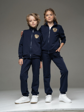 Отличный костюм из футера темно-синего цвета , состоящий из джемпера на молнии, с боковыми карманами и брюк с манжетами снизу. Изделие выполнено из трикотажа премиального качества - ПЕНЬЕ, с содержанием хлопка более 92%