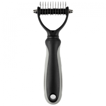 Незаменимый аксессуар в обиходе любого владельца домашнего питомца. Даже при тщательном уходе шерсть может сбиться к колтуны и запутаться, и попытки распутать будут доставлять трудности, а с колтунорезом можно быстро привести шерсть в порядок. Размер рукояти удобен для удержания в руке, лезвия колтунореза располагаются с двух сторон, что облегчает работу.