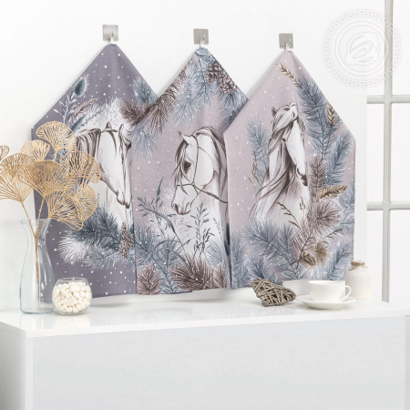 «Поэма» – зимняя сказка в интерьере дома. Перед нами полотенца для кухни с символом нового года 2026. В окружении пушистых веток ели изображены грациозные лошади. Композиция лаконичная и утонченная, с теплыми и приятными глазу оттенками. Набор полотенец из рогожки украсит кухню и подарит уют.