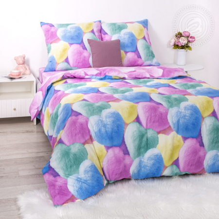 «Шерри» – комплект постельного белья с сердечками из ткани бязь. Оно сочетает в себе практичность материала и нежность дизайна. Композиция состоит из мягких и пушистых сердец, выполненных в популярных оттенках. Рисунок милый, очаровательный и плюшевый. Он дарит ощущение весны, радости и мечтательности. Трендовый принт с сердечками понравится и детям, и подросткам, и взрослым. Это яркое дополнение для Вашей комнаты!