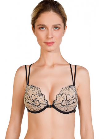 Бюстгальтер Push-Up с градуированной чашкой Aosta (небольшая градуация, прямые срезы и заниженная застежка спереди). Регулируемые бретели. Высота бока трусиков 5 см. Выполнен из кружева. Коллекция "Valerie".