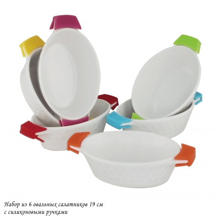 142-025 Набор из 6 овальных салатников 19см с силикон. ручками в под.уп.(х6)Фарфор (арт. 142-025)