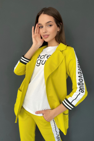 Жакет полуприлегающего силуэта, длиной до середины бедра, с английским воротником. Рукав втачной, длинной 7/8, с отделочным лампасом вдоль рукава, на эластичном манжете. В нижней части полочки расположены накладные карманы. Спинка с рельефами.